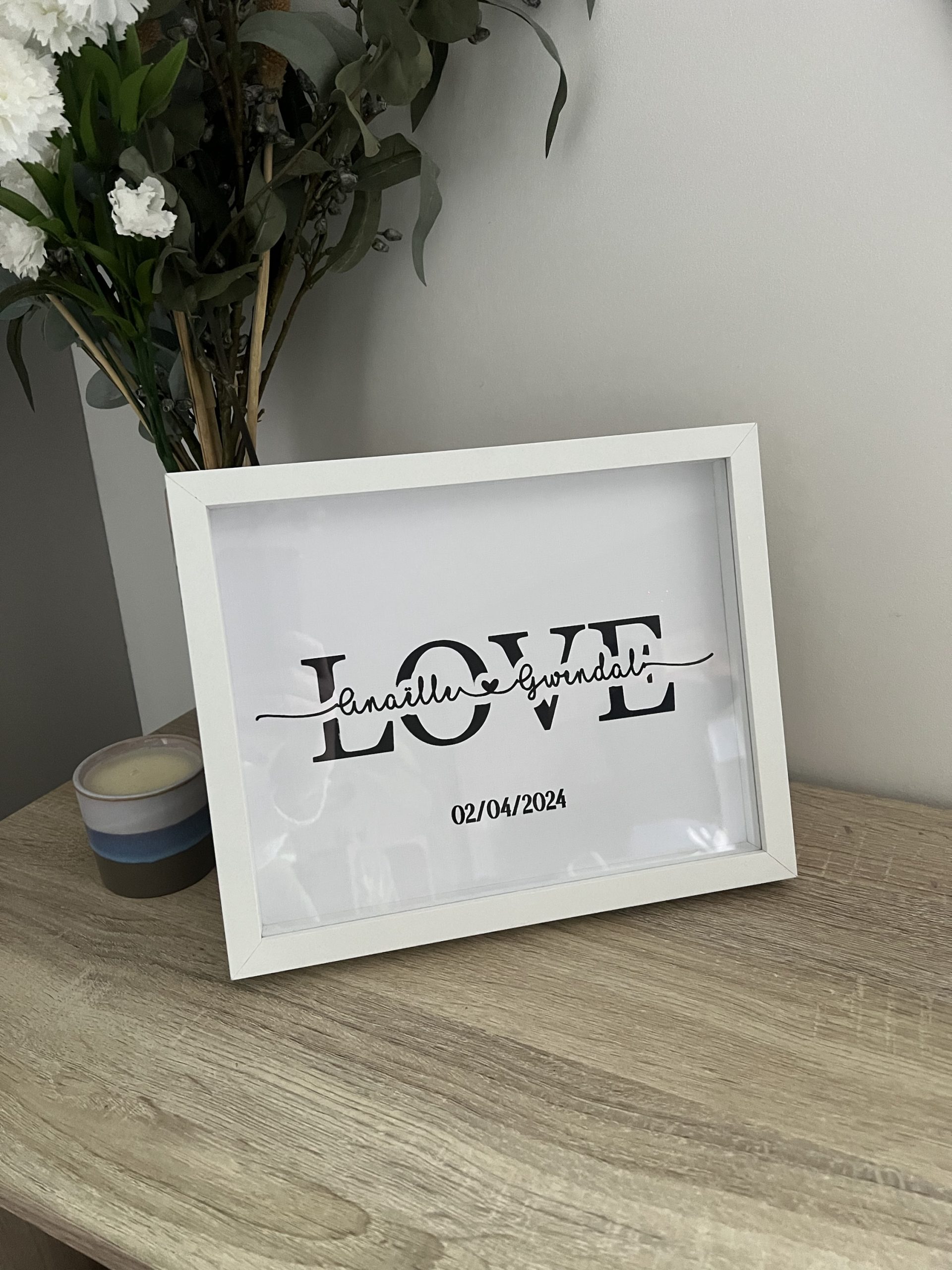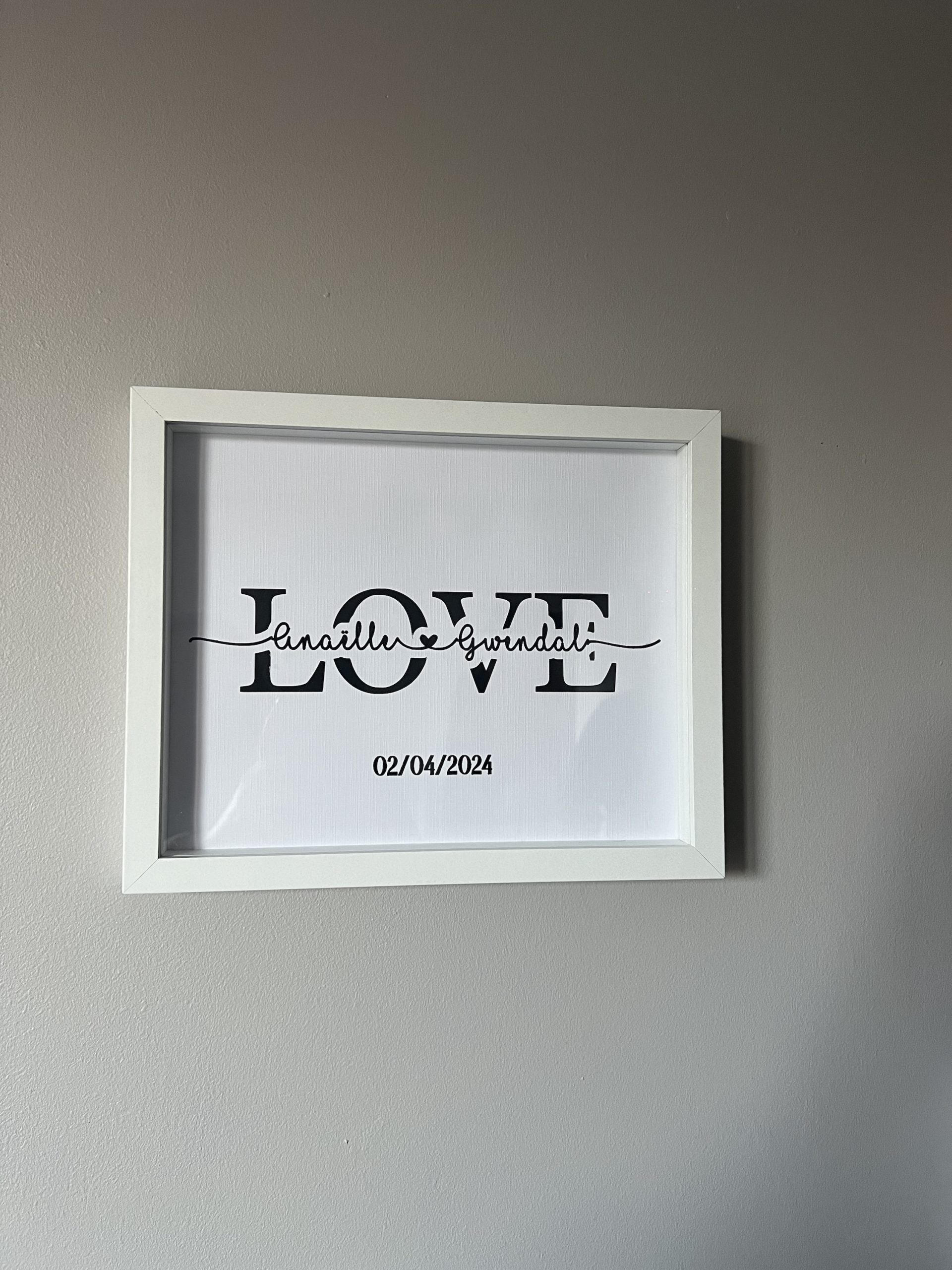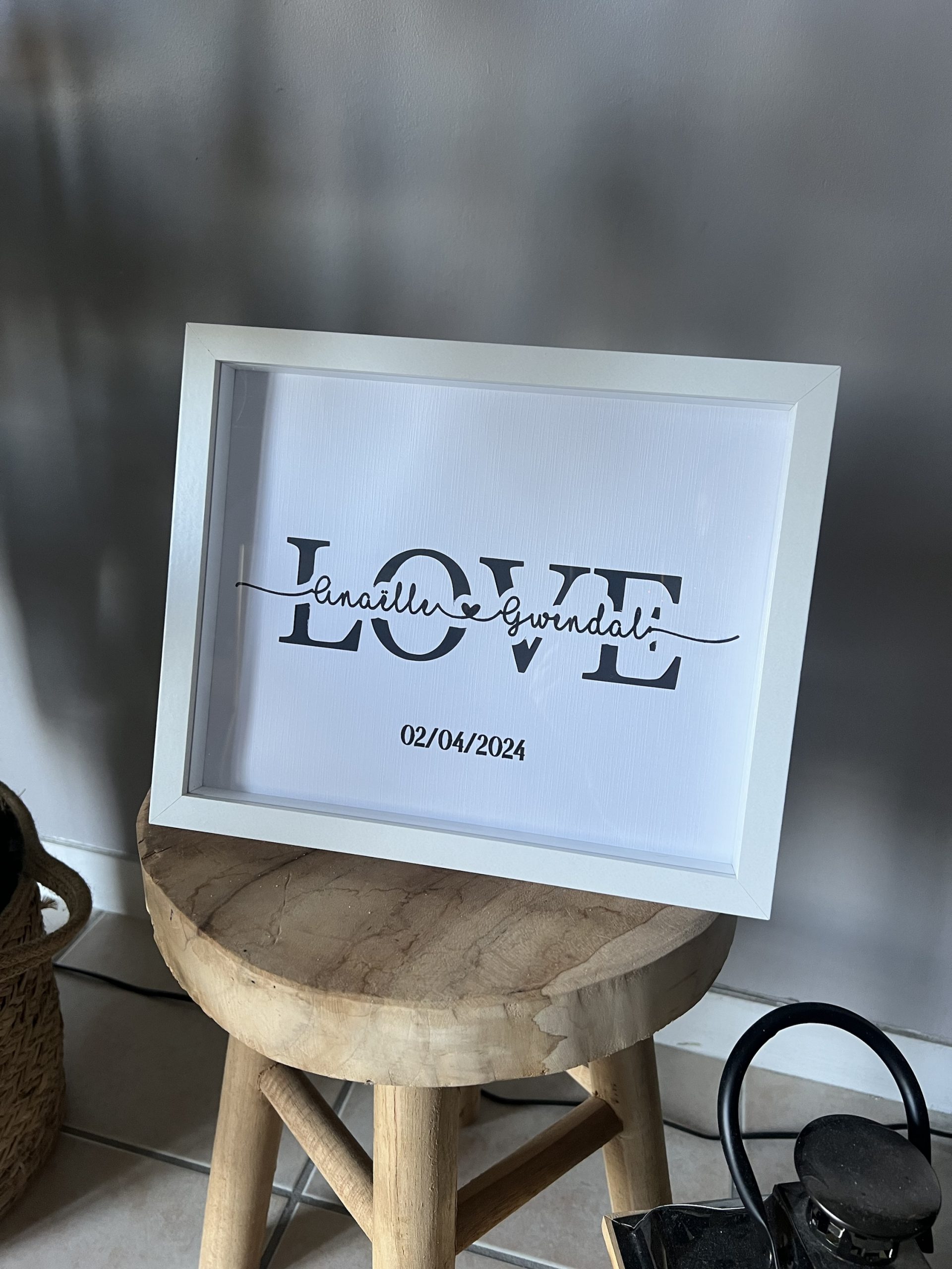 Un cadre élégant et moderne avec le mot « LOVE » et les prénoms de votre choix. Une idée cadeau idéale pour un couple, un mariage ou la Saint-Valentin !